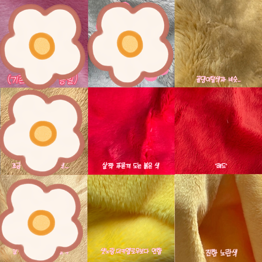 ▲ 해당 원단 사용 요청 시 1,000원 할인해드려요! (털 길이 문제로 10깅만 선택 가능 / '진한 노란색' 제외 일괄 5mm입니다.)